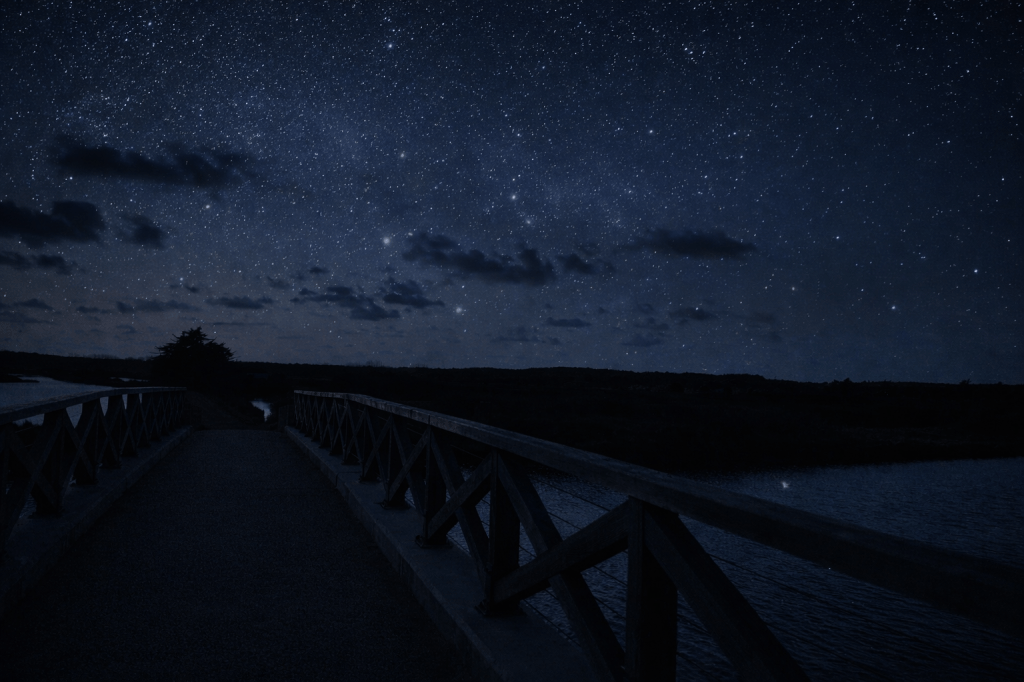 Nous nous sommes arrêtés de marcher pour écouter, levant ensemble les yeux vers l’univers étoilé, vers ces mille feux, ravissement de clarté.